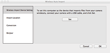 | [Bonjour] | Reconfigure the Wi-Fi connection between your Mac and camera again. If your Mac does not respond when you select MENU - (Send to PC) on the LCD screen of your camera, cancel the file import and then try again following the steps below.