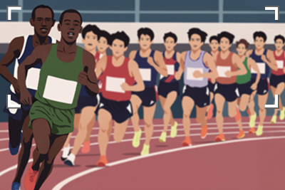 陸上の短距離競技、長距離トラック競技、長距離ロード競技で順位が急に変わるような場合にも先頭の選手にピントを合わせることができます。選手の顔がAF枠内に入るようにするため、[カスタム]のフォーカスエリアを選手の腰から頭までが入る大きさに設定してください。