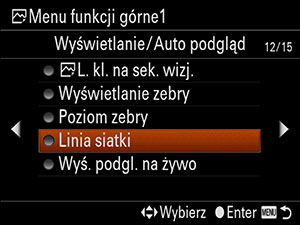 Przejdź do ekranu [Wyświetlanie/Auto podgląd] przy użyciu lewej/prawej strony pokrętła sterowania. Następnie wybierz [Linia siatki] i naciśnij środkową część pokrętła sterowania.
