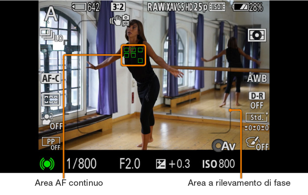 Quando si utilizza [AF continuo] (AF-C), un buon modo per ottenere un feedback sulla messa a fuoco della fotocamera è abilitare le funzioni [Visual. area AF cont.] (Visualizza area AF continuo) e [Area a rilev. di fase] (Area a rilevamento di fase) nel menu delle Impostazioni personalizzate: