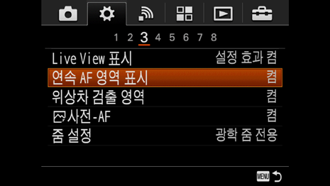 또한 MENU > (사용자 정의 설정) > [연속 AF 영역 표시] > 원하는 설정을 선택하여 [연속 AF 영역 표시]를 활성화할 수도 있습니다. 이 기능은 얼굴이 감지되지 않을 경우 초점이 맞는 영역을 표시합니다. 이는 카메라가 여전히 선명한 이미지를 산출할 수 있는 영역에 초점을 맞추었음을 알려줍니다(예: f-스톱 초점 거리와 피사체의 거리에 따라 얼굴 대신 목에 초점을 맞추어도 좋은 경우). 이 기능은 [연속 AF]에서만 사용할 수 있습니다.