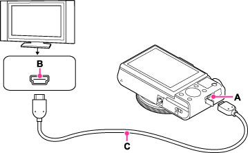 Tilslut kameraets HDMI-stik (A) og tv'ets HDMI-stik (B) ved hjælp af HDMI-kablet (sælges separat) (C).