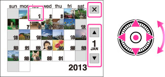 هنگامی که [وضعیت مشاهده] بر روی [مشاهده تاریخ] تعیین شده است و نمایش صفحه در وضعیت فهرست است، اهرم W/T (بزرگنمائی) را برای مشاهده تصاویر با تقویم به طرف W (