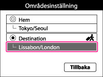 Ställ in detta läge när du är ute och reser för att använda den tid som gäller där du befinner dig. Ställ in destinationsområdet.
